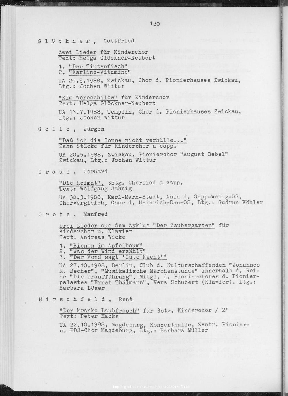 Ludwig Müller: Zeitgenössisches Musikschaffen in der Deutschen Demokratischen Republik, Uraufführungen 1988 (Dresden: Sächsische Landesbibliothek Dresden, 1989)